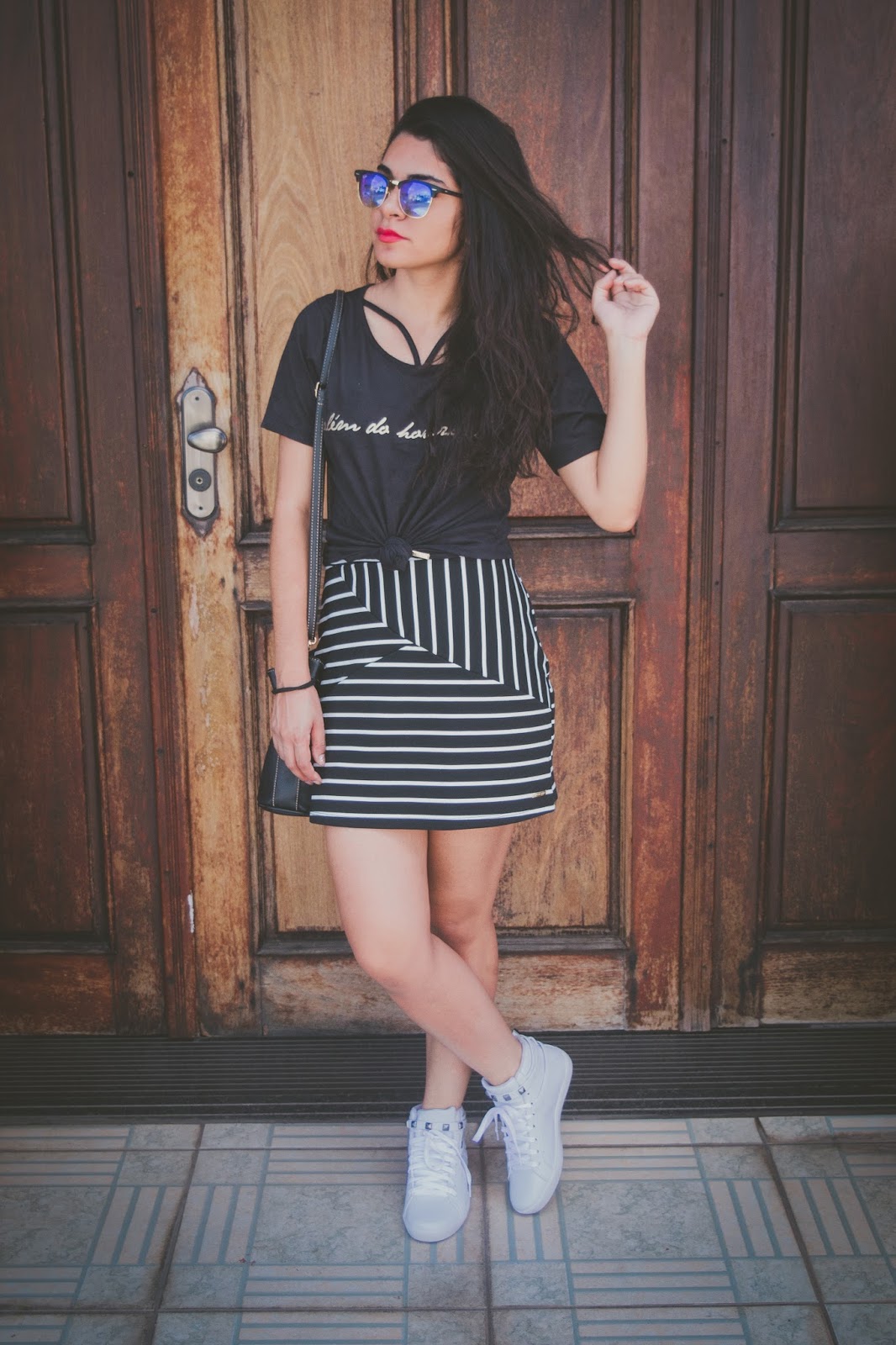 Ah, a t-shirt é da Emepê e a saia listrada de todas as formas que tá super em alta pro inverno é da Vizzual. Pra complementar, apostei no queridinho das it girls: o tênis branco (com tachas!) que também é da Emepê. To meio apaixonada por esse look que já quero usar milhões de vezes essa combinação.